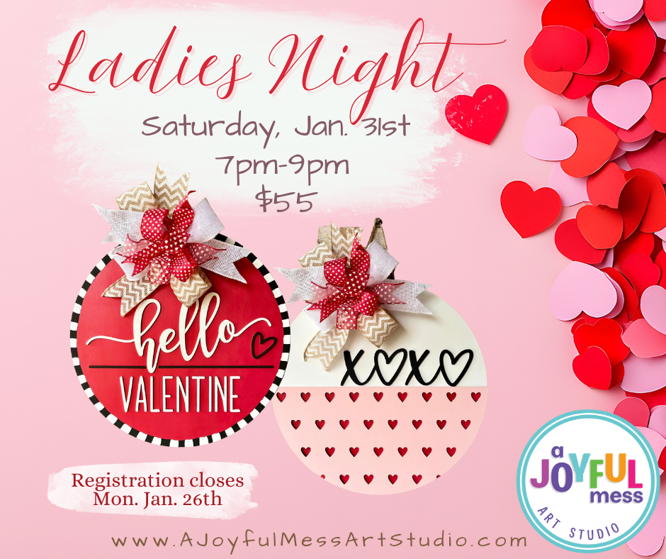 Join us for a night of creativity! Our talented teachers will walk you through creating your very own 18" wooden 3D Valentine's door hanger. You'll be the envy of the neighborhood with your adorable Valentine's door hanger!